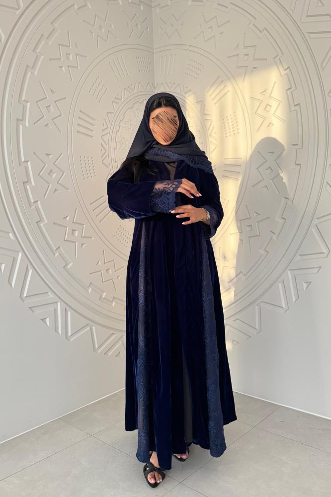 عباية راقية بلون كحلي أنيق مصنوعة من قماش ناعم ومريحة بالارتداء، مزينة بـ دانتيل كحلي فاخر يضفي لمسة فخامة كلاسيكية.