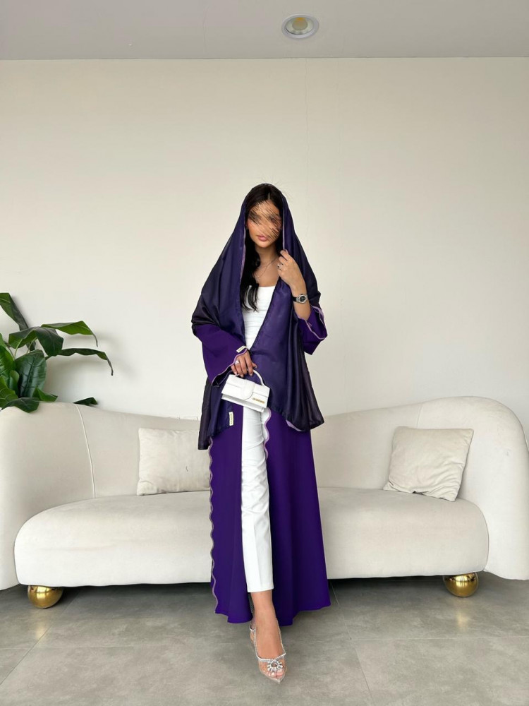 تألقي بإطلالة أنيقة مع عباية كلوش مصممة من قماش كريب جورجيت بلون الموف الأنيق، مع طرحة وجهين (موف فاتح ساده وموف مدرج). لمزيد من التفاصيل حول قماش الطرحة، يُرجى التواصل معنا عبر الإنستقرام.