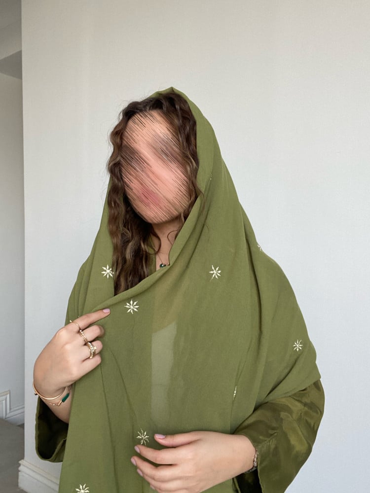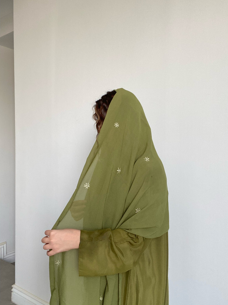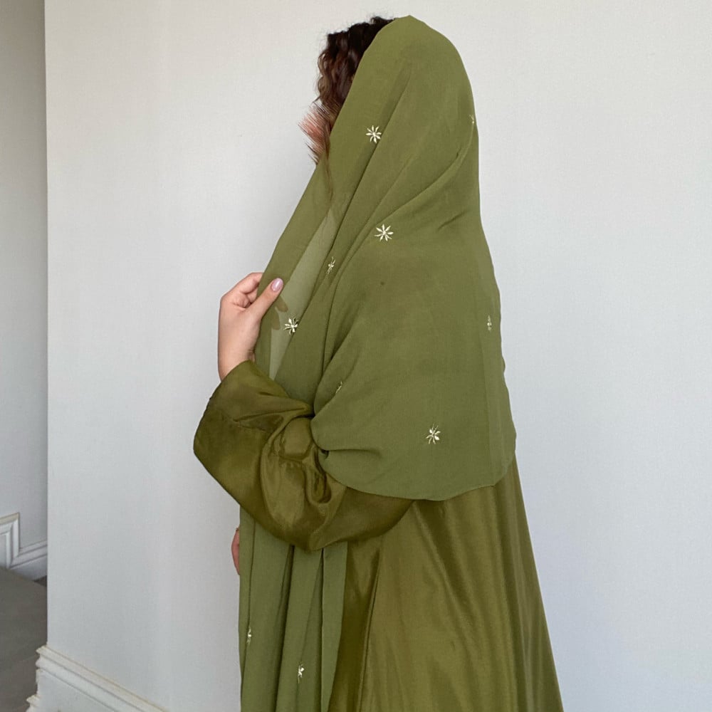 ✨ عباية كريب حرير زيتي مع طرحة مطرزة – أناقة فاخرة بلون هادئ ومميز