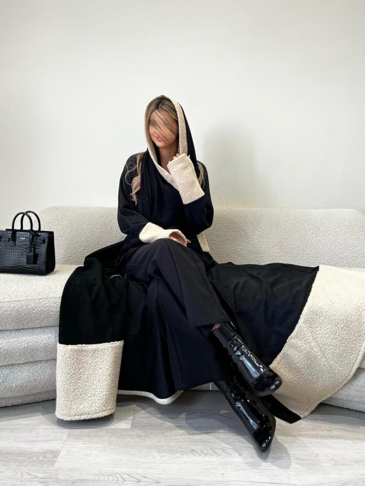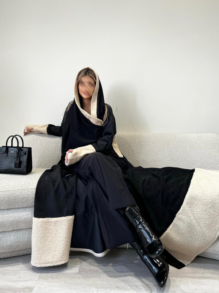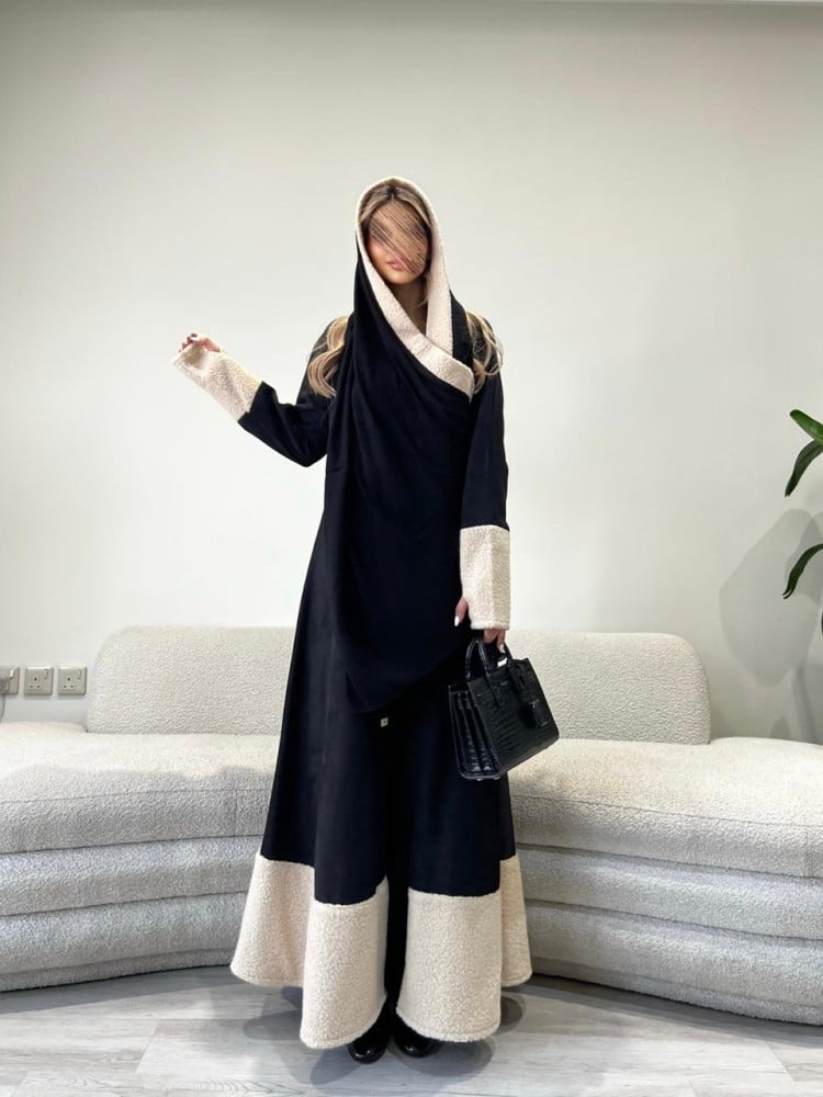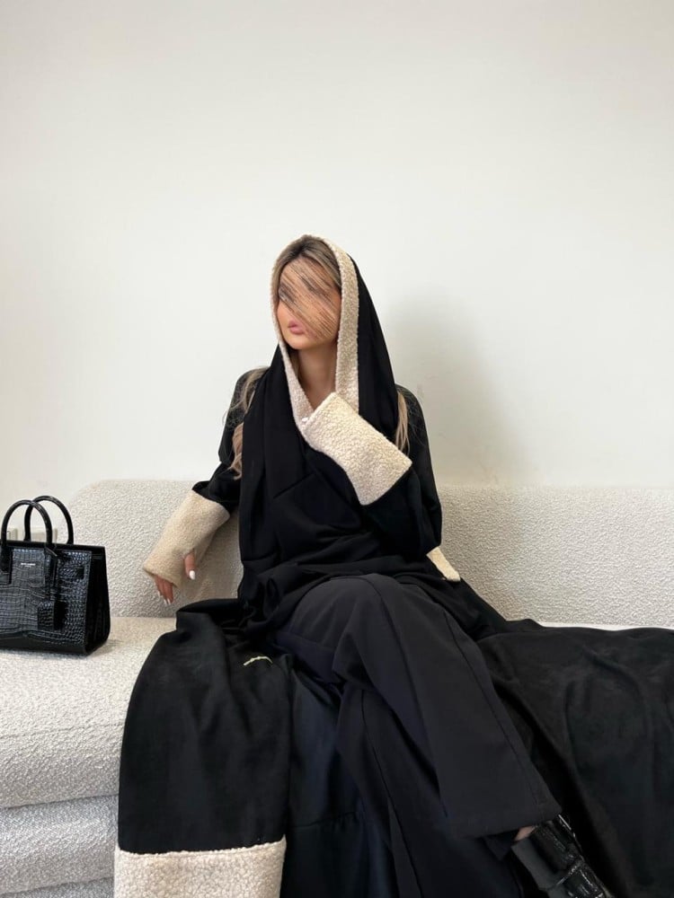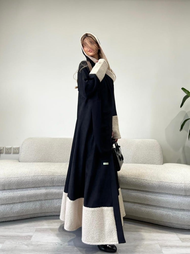ارتقي بإطلالتك مع عباية مصممة من قماش الشمواه الأسود الفاخر، بلمعة ناعمة وملمس مخملي يوحي بالفخامة. القصة نص كلوش تضيف حركة انسيابية وأناقة ناعمة، مثالية للشتاء أو المناسبات الخاصة.