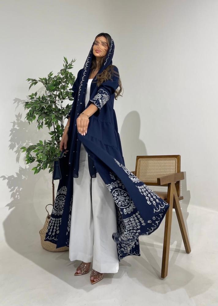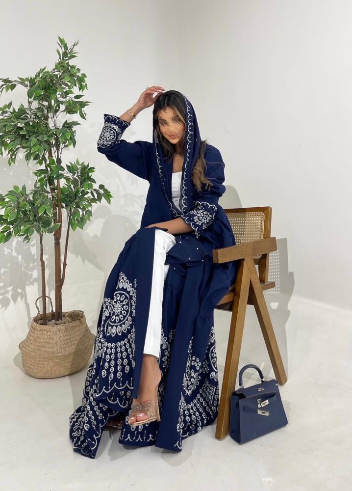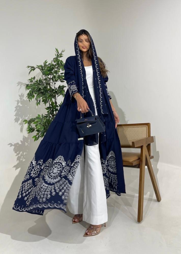 عباية أنيقة مصنوعة من قماش كريب كحلي واقف بملمس فخم وهيكل متماسك يمنح حضورًا مميزًا.