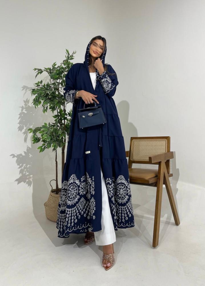 عباية كريب كحلي واقف بتصميم دبل كلوش وتطريز خاص راقٍ