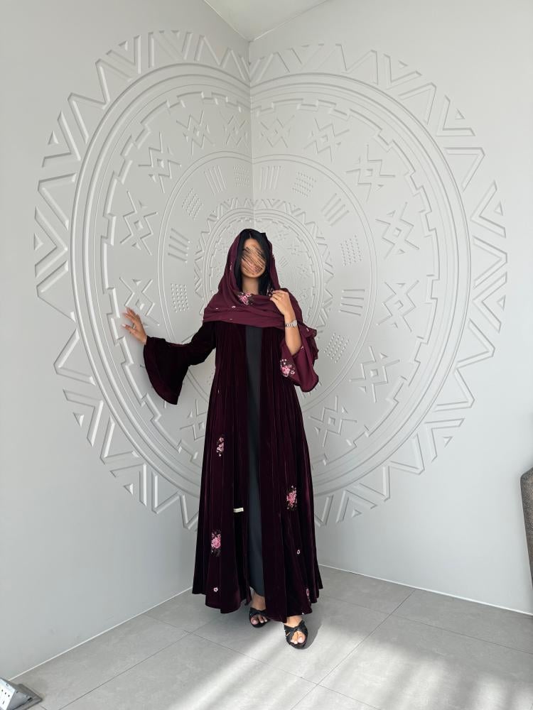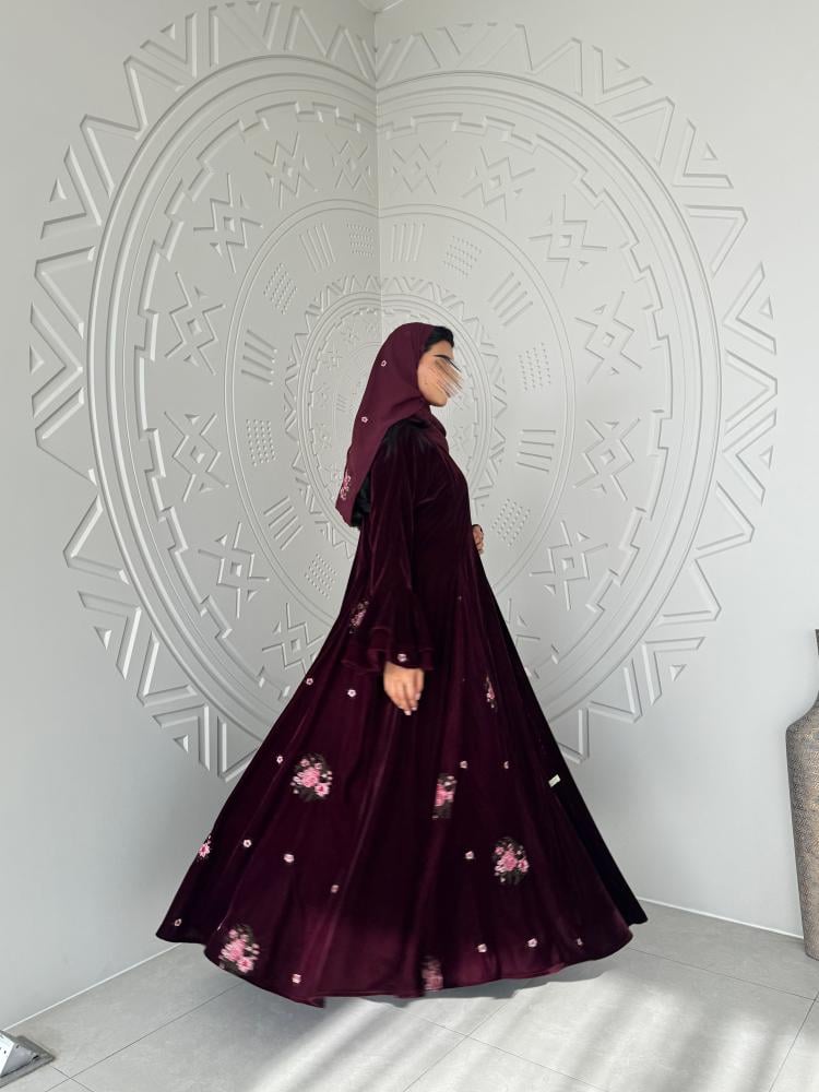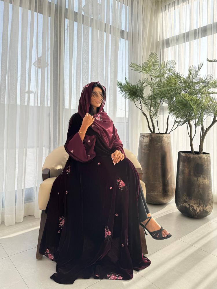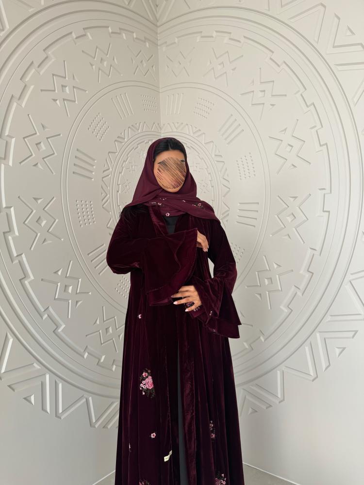 عباية فاخرة مصنوعة من قماش المخمل الفاخر بلون خمري أنيق يعكس الفخامة والرقي، مزينة بتطريز ناعم موزع بدقة ليعزز جمال التصميم.