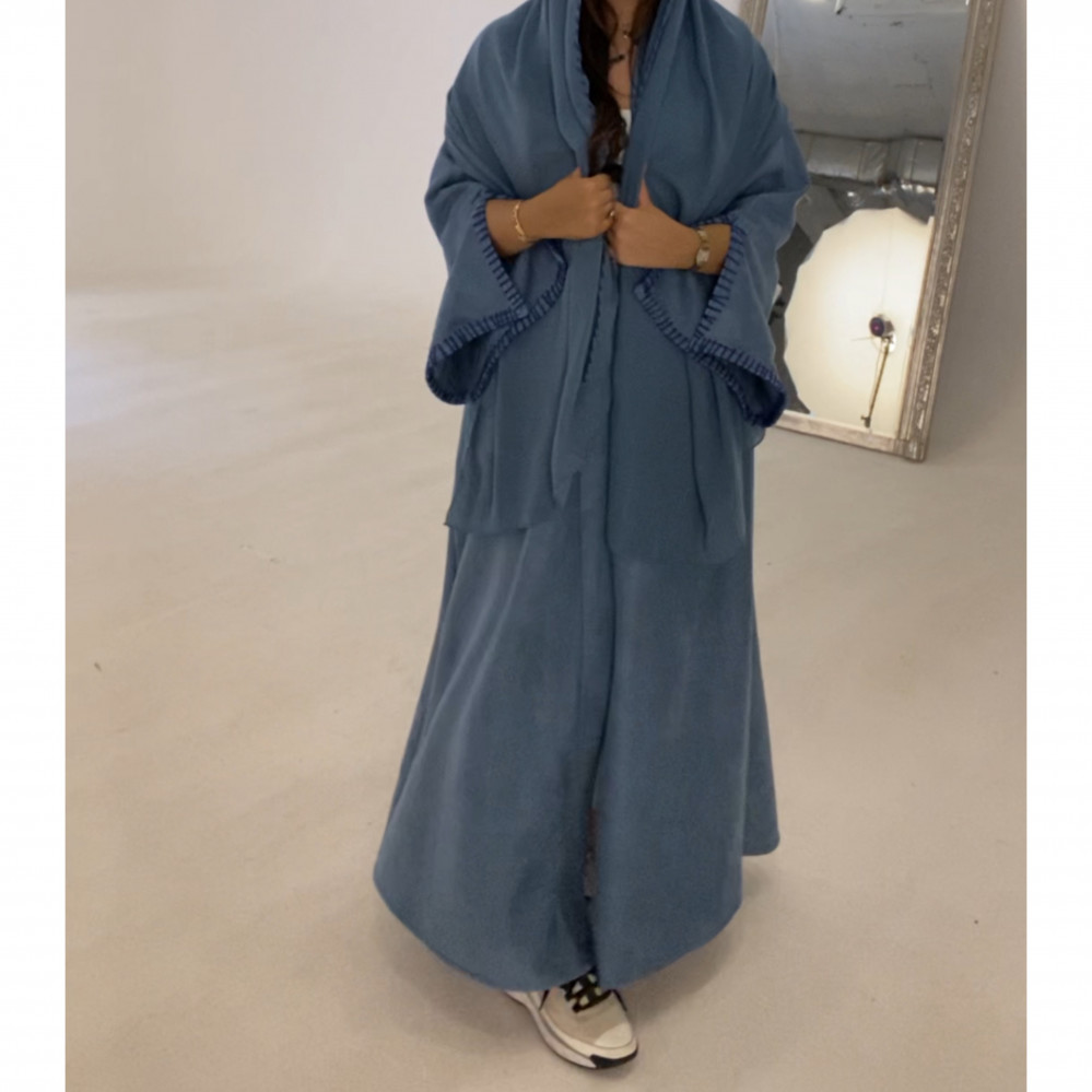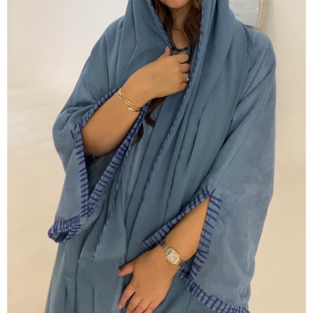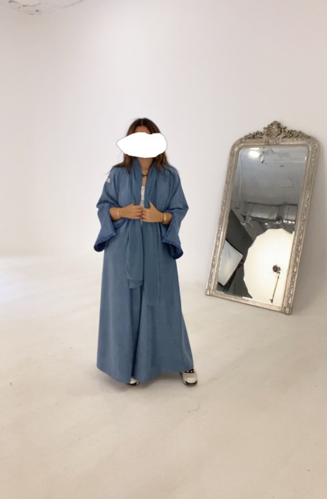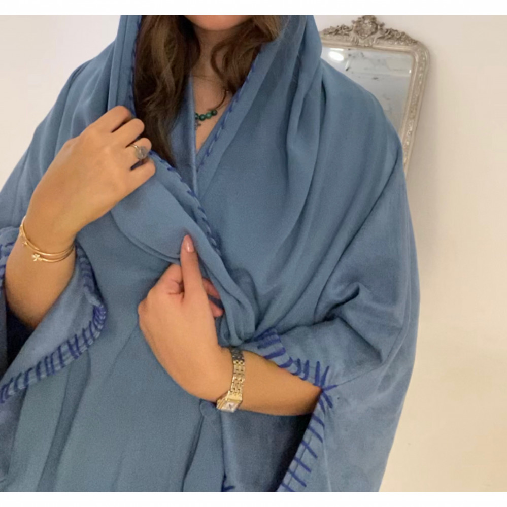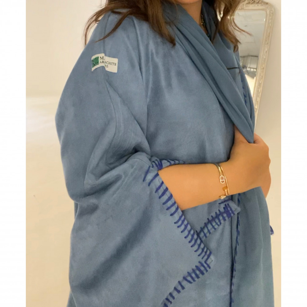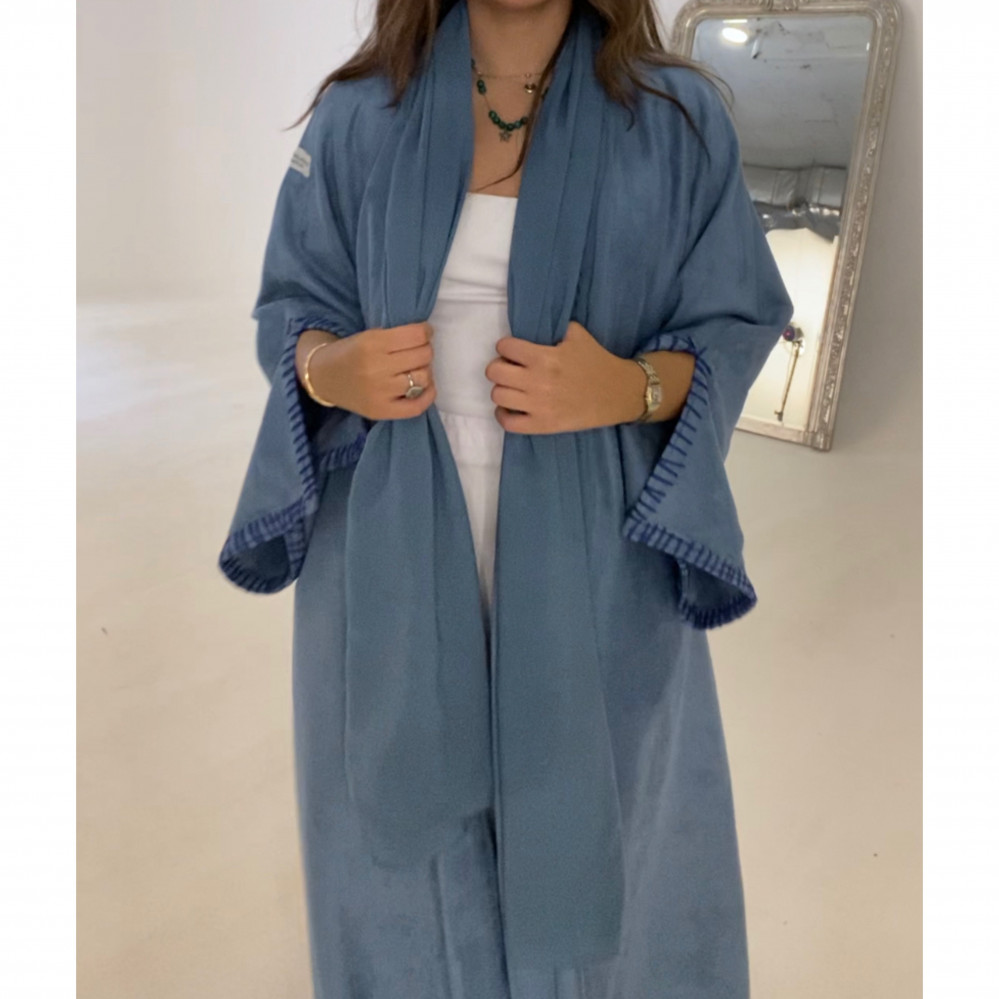 عباية مصممة من قماش شمواه ناعم بلون سماوي راقٍ، تمنحكِ إطلالة أنثوية فخمة بلمسة دافئة. مناسبة للمناسبات والأيام الباردة.
